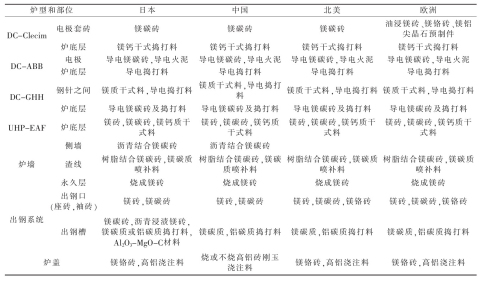 摘 要:由三根電極的普通交流電弧爐發(fā)展為超高功率(UHP)及一根電極的直流(DC)電弧爐,爐體結構有一些改變。針對各部位的損毀因素,內襯用的耐火材料也有所發(fā)展。例如普通電弧爐的爐頂用高鋁磚、爐墻鎂磚砌筑,而UHP及DC電弧爐采用大面積水冷爐頂、爐墻,爐頂三角區(qū)采用剛玉澆注料或預制件,爐墻用鎂碳磚,蝕損嚴重部位采用噴補作業(yè)。還介紹了日本等一些國家DC和UHP的各種爐型用耐火材料。煉鋼電弧爐是以電極端部和爐料之間發(fā)生的電弧為熱能進行煉鋼的設備。電弧爐以廢鋼為爐料直接煉鋼,與礦石煉鐵后再煉鋼相比,基建投資少,節(jié)能60%、節(jié)水40%、減少廢氣排放86%、減少廢渣97%[1]。交流電弧爐歷史悠久,交流電是通過三根石墨電極輸入爐內,在電極下端與金屬料之間產生電弧,利用電弧高溫直接加熱爐料,使煉鋼過程得以進行。供電功率越高,爐料熔化速度越快,降低能量消耗越多,因此出現(xiàn)超高功率(UHP)電弧爐。在超高功率的基礎上發(fā)展了直流(DC)電弧爐煉鋼。直流電弧爐是以一根石墨電極的端點為陰極,爐底為陽極,石墨電極位于爐膛中心部位。與UHP相比設備結構簡單,建設費用低,熔池中的電流與熱量分布比較均勻,不存在過熱區(qū)域,因此耐火材料損耗比較小、節(jié)能且噪音小等。目前,煉鋼電弧爐向大型化、控制自動化方向發(fā)展。我國的電弧爐主要用來生產合金鋼。煉鋼水平與工業(yè)發(fā)達國家相比差距較大,如2015年我國電爐鋼占粗鋼總產量的6.1%,2020年有所提高,但也不超過10%,與世界平均水平的30%相比還有較大差距。我國已經引進先進水平的UHP和DC電弧爐,隨著經濟發(fā)展,工業(yè)化程度提高,必然伴以廢鋼資源數(shù)量增加,同時發(fā)展鐵礦石直接還原煉鐵技術,代替廢鋼,增加電弧爐煉鋼的爐料,還有核電的發(fā)展,使電弧爐煉鋼有了物質保證。電弧爐的內襯是耐火材料構成的,隨著UHP和DC技術的發(fā)展,需要新型優(yōu)質耐火材料與之相配套。有人說[2]:沒有優(yōu)質爐襯、爐底耐火材料支持長壽爐齡,超高功率電弧爐就無法發(fā)揮高效生產的優(yōu)勢。爐底耐火材料是直流電弧爐得以實現(xiàn)的必要條件,反映了煉鋼與耐火材料技術的互相影響,互為依存,在電弧爐煉鋼系統(tǒng)優(yōu)化生產中有不可分割的作用。1 電弧爐的結構變化傳統(tǒng)的電弧爐由爐頂(又稱爐蓋)、爐墻、爐坡、爐底和出鋼槽構成,全部用耐火材料構筑,外包鋼制爐殼。爐墻一側設有爐門,另一側為出鋼口,并與出鋼槽相連。而UHP和DC電弧爐采用偏心爐底出鋼,使爐體由傾動式改為固定式,爐底有供氣攪拌設置,爐頂安裝氧-燃料燒嘴,在爐底偏心位置設置出鋼口,代替出鋼槽。由于取消了傾動設備,擴大了水冷面積,緩和了爐襯的損毀,適當降低了出鋼溫度,并縮短了出鋼時間,從而降低生產成本。爐墻采用鑲砌水冷箱式水冷套措施,其內表面噴涂一層耐火涂料,使其掛渣形成保護層,可有效降低耐火材料消耗,但電耗可能增加。國外有的電弧爐功率達1 000 kV·A/t以上,爐墻壽命達2 000爐次以上,水冷爐蓋壽命達4 000爐次,降低耐火材料消耗60%以上。2 耐火材料內襯的損毀因素電弧爐內襯的耐火材料長期處于高溫、熔渣侵蝕和急熱急冷狀態(tài)下,工作條件極其惡劣。在煉鋼的熔化期和氧化期,不致于因高溫損壞爐襯,但在還原期的鋼液溫度相當高,又受電弧直接輻射(有時溫度達4 000℃以上),爐襯很容易造成熔融損壞。出完鋼裝料時,爐襯溫度突然下降,裝完料開始送電,溫度又逐漸升高,這種急冷急熱是爐襯剝落的直接原因,主要是爐頂容易剝落。耐火材料內襯損毀的主要因素包括[3]:(1)化學侵蝕。FeO或渣中SiO2與耐火材料中的CaO、MgO之間的化學反應,使爐襯變?yōu)槿墼鴮е聯(lián)p毀。(2)耐火材料內襯中的碳成分被含氧成分(如FeO、O2、MgO等)氧化,導致耐火材料脫碳而損毀。(3)沖刷和機械沖擊。鋼水或熔渣流過耐火材料表面,以物理性磨損或沖刷爐襯,而導致內襯損毀;在出鋼口、渣線、電極口或排氣口平臺等沖刷嚴重,廢鋼等爐料吊入往往撞擊爐襯而損毀。(4)水化。在生產過程中,往往會出現(xiàn)爐頂或爐墻漏水或滲水,還有水蒸氣,與堿性耐火材料中的MgO、CaO進行水化反應,使內襯損毀。3 電弧爐用耐火材料根據(jù)電弧爐的結構,由于各部位承受的熱負荷大小不同,與熔渣、鋼水接觸作用及機械損壞程度存在差異,不同部位必須采用不同的耐火材料[4]。3.1 爐頂(蓋)我國中小電弧爐普遍采用燒成或不燒高鋁磚,局部用高鋁質或剛玉質不定形耐火材料預制件。大型超高功率電弧爐和直流電弧爐采用水冷技術,除三角區(qū)外,爐頂耐火材料不是關鍵。三角區(qū)由于強烈熱震及電極熱輻射苛刻,國外普遍采用剛玉質或鋁鉻質搗打料,我國一般用高鋁質或剛玉質搗打料。天津鋼管集團公司150 t超高功率電弧爐,爐頂三角部分(三個電極孔周圍)采用鉻剛玉質澆注料預制件,預先烘烤,現(xiàn)場直接使用,并解決了電極孔定位的難題。還針對氧槍上部損毀較快問題,在該區(qū)域采取局部加厚處理,使爐頂各部分損毀速度基本一致,最高壽命達676爐次。3.2 爐墻(壁)分為一般爐墻、渣線區(qū)和臨近電弧的熱點部位爐墻。一般爐墻主要用鎂磚、白云石磚砌筑,也有用不燒鎂磚和瀝青結合的鎂質及白云石質搗打料。超高功率和直流電弧爐冶煉特殊鋼的爐壁